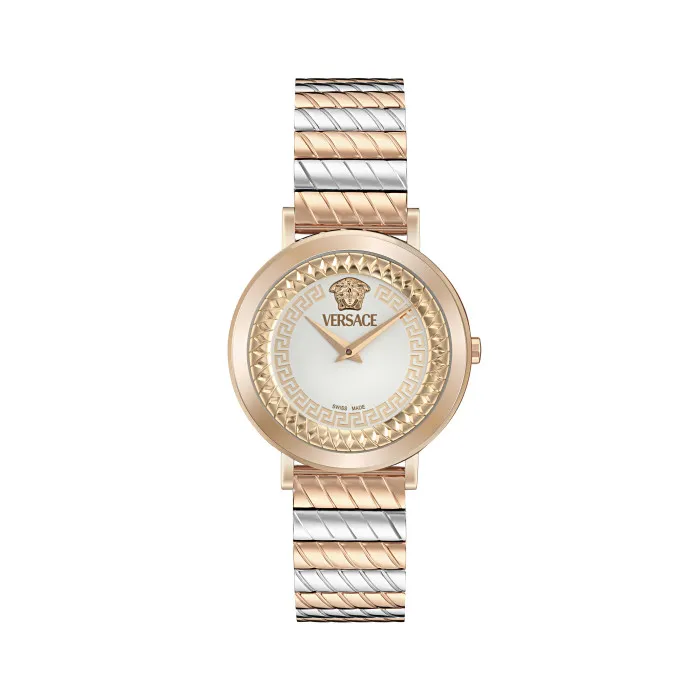 Cette collection allie héritage et modernité. Le boîtier emblématique reflète les motifs d’accessoires de versace, avec une chaîne sur toute la bague intérieure apportant une profondeur intéressante au cadran ainsi que la greca sur le cadran. Cette montre analogique est équipée d’un mouvement swiss made.