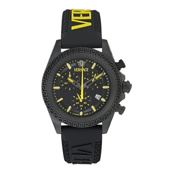 Audacieuse et affirmée, la versace fornax se distingue par une greca 3d saisissante sur la bague supérieure, associée à un motif texturé subtil. Cette montre chronographe dispose d’une fonction calendrier : date, est équipée d’un chronomètre, d’aiguilles luminescentes, de chiffres luminescents et possède un mouvement swiss made.