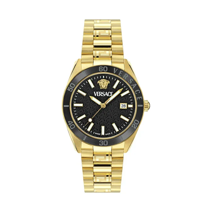 Cette montre emblématique de la collection ss22 a conservé son incroyable design innovant caractérisé par un verre en forme de dôme et une bague supérieure audacieuse avec l'inscription versace et une finition greca. Cette montre analogique dispose d'une fonction calendrier : date, swiss made, aiguilles lumineuses et chiffres lumineux.