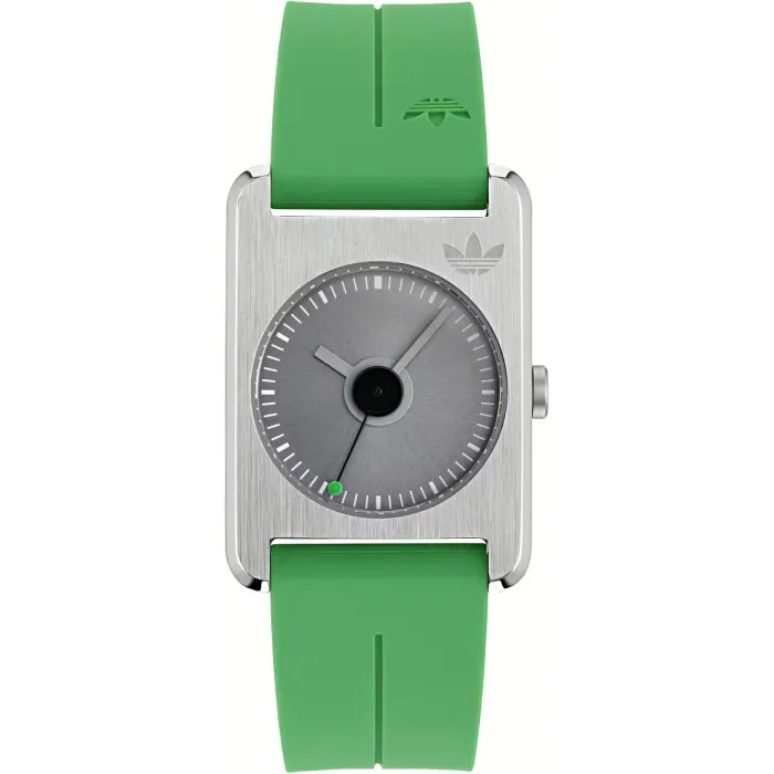 De Adidas Originals® Analogue 'Retro Pop One' Unisex Horloge AOST23561 is een frisse kijk op casual tijdmeting, ontworpen om je stijlvol te houden zonder in te boeten op functionaliteit. Dit horloge weerspiegelt de iconische geest van Adidas Originals, waarbij hedendaags design wordt samengevoegd met een knipoog naar retro esthetiek. Met een rechthoekige behuizing van roestvrij staal toont het een slanke silhouette die zowel modern als tijdloos is. Het horloge heeft een behuizing met een diameter van 31 mm, die comfortabel is voor dagelijks dragen, en de dikte van 9 mm zorgt voor een lichte feel om je pols. De opvallende grijze wijzerplaat wordt beschermd door duurzaam mineraalglas, wat zorgt voor helderheid en veerkracht tegen dagelijks gebruik. Met zijn quartz beweging kun je rekenen op nauwkeurige tijdmeting, wat het een betrouwbare accessoire maakt voor zowel casual uitjes als je actieve levensstijl. De levendige groene siliconen band voegt een vleugje kleur toe, en biedt zowel comfort als stijl met een lengte van 20 cm en een breedte van 21 mm die moeiteloos om de meeste polsen past. Voorzien van een veilige gespsluiting, zorgt dit horloge ervoor dat het stevig op zijn plek blijft terwijl je door je dag beweegt. Het ontwerp is waterdicht tot 3 bar, waardoor het geschikt is voor lichte spatjes, terwijl het totale gewicht van slechts 47 gram ervoor zorgt dat je nauwelijks merkt dat het om je pols zit. Dit unisex model past perfect bij elke outfit en maakt het een essentiële aanvulling op je accessoirecollectie. Of je nu naar de sportschool gaat of vrienden ontmoet voor een casual lunch, dit horloge straalt met zijn levendige karakter en praktische functionaliteit, en laat trots de essentie van Adidas Originals zien.
