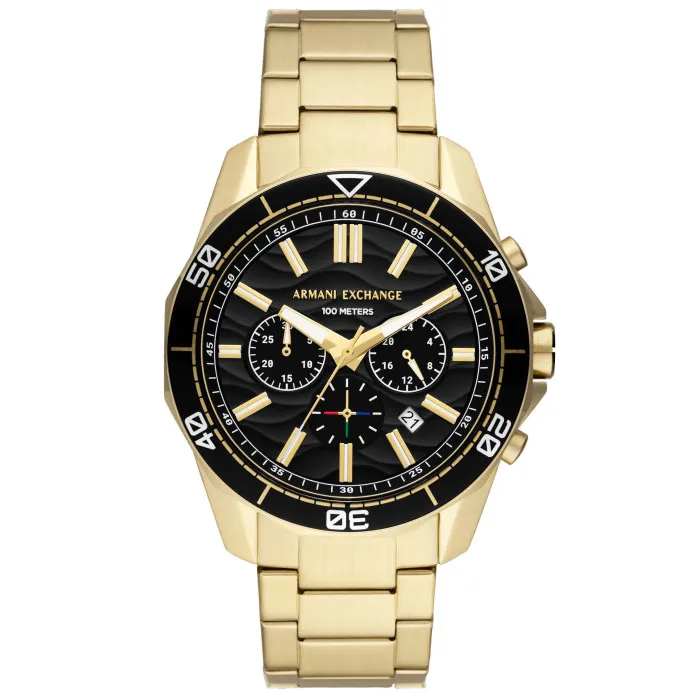 Ontdek de Armani Exchange® Chronograph 'Spencer' Herenhorloge AX1958, een meesterwerk in zowel esthetiek als functionaliteit. Bekend om de combinatie van luxe en prestaties, belichaamt de Spencer-serie de geest van moderne mannelijkheid. Gemaakt van hoogwaardig roestvrij staal, heeft het horloge een gouden kast die betovert met zijn gedurfde ronde diameter van 44 mm. Dit duikhorloge is ontworpen voor de man die zowel avontuur als verfijning waardeert. De slanke zwarte wijzerplaat vormt een prachtig contrast met de lumineuze wijzers en cijfers, waardoor zichtbaarheid in elke verlichting gegarandeerd is, of je nu de diepten in duikt of een statement maakt op het droge. Een van de opvallende kenmerken is de draaibare bezel, die niet alleen bijdraagt aan het onderscheidende uiterlijk maar ook de praktische functionaliteit vergroot. De chronografische weergave biedt functionaliteit, waarmee je de tijd nauwkeurig kunt bijhouden via het ingewikkelde stopwatchmechanisme. Met een dikte van 13 mm heeft het de perfecte balans van aanwezigheid zonder te log te zijn. Bovendien is het horloge waterbestendig tot 10 bar, wat het ideaal maakt voor degenen die een actief leven leiden. De band is even opvallend, met een luxueuze gouden afwerking van roestvrij staal en een lengte van 21 cm en een breedte van 21 mm, ontworpen om comfortabel om elke pols te passen. De vouwsluiting met drukknop zorgt voor een veilige maar stijlvolle draagervaring. Niet alleen is dit horloge een betrouwbare metgezel voor de avontuurlijke geest, maar het tijdloze ontwerp maakt het een veelzijdige aanvulling voor elke garderobe, geschikt voor zowel casual uitjes als formele bijeenkomsten. De Armani Exchange 'Spencer' is niet zomaar een horloge; het is een statement van stijl, functionaliteit en duurzaamheid die perfect aansluit bij de levensstijl van de moderne man.Koop Armani Exchange® Chronograph 'Spencer' Herenhorloge bij Ormoda