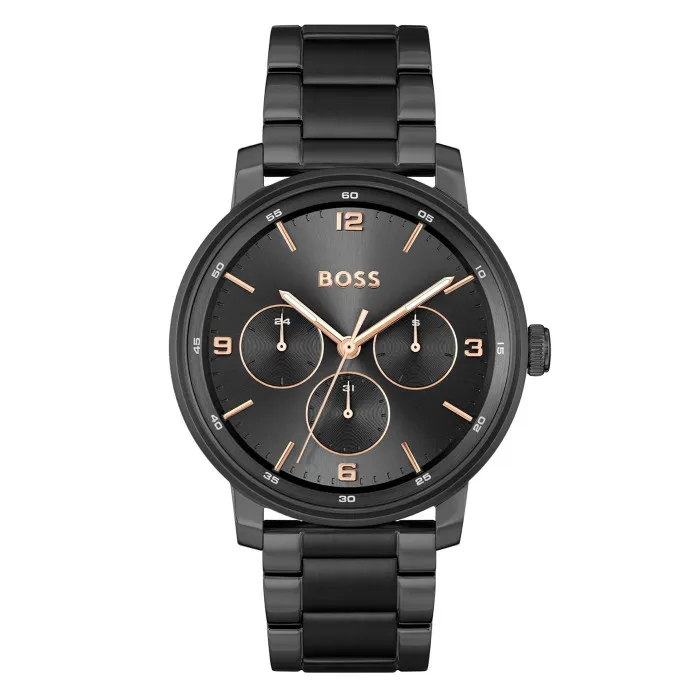 Introducing de Hugo Boss® Multi Dial 'Contender' Horloge voor Mannen 1514128, waar verfijnde stijl samenkomt met functionaliteit. Dit tijdloze accessoire belichaamt de moderne man die op zoek is naar een veelzijdig ontwerp dat elke gelegenheid aanvult. De horloge is voorzien van een opvallende zwarte roestvrijstalen kast met een diameter van 44mm, waarin een robuuste quartz beweging is verwerkt die zorgt voor nauwkeurigheid in het bijhouden van de tijd. De zwarte klok biedt een elegante uitstraling en duidelijkheid bij het aflezen met zijn multi-dial weergave. Een mineraalglas venster beschermt de klok tegen dagelijkse slijtage, en dit benadrukt de aandacht voor detail waar Hugo Boss om bekend staat. Deze horloge heeft niet alleen een betoverend ontwerp, maar ook praktische functies. Het is uitgerust met een dag-datum kalender, perfect voor de drukke professional die zowel stijl als functionaliteit waardeert. De 10mm dikke kast zorgt voor een stevige maar comfortabele pasvorm om de pols. Daarnaast heeft de horloge een waterbestendigheid tot 5 bar, wat het geschikt maakt voor dagelijks gebruik, of je nu op kantoor bent of buiten avonturen beleeft. Met een bandlengte van 21cm en een breedte van 21mm biedt de zwarte roestvrijstalen band een veilige en comfortabele pasvorm, compleet met een opklapbare drukknopsluiting voor eenvoudig vastmaken. Met een gewicht van 136g is deze horloge perfect in balans - niet te zwaar en niet te licht - en een genot om de hele dag te dragen. De Hugo Boss® Multi Dial 'Contender' dient niet alleen als een praktisch accessoire maar ook als een statement van luxe en verfijning. Het is de perfecte aanvulling op je horlogecollectie en weerspiegelt je impeccable smaak en stijl.