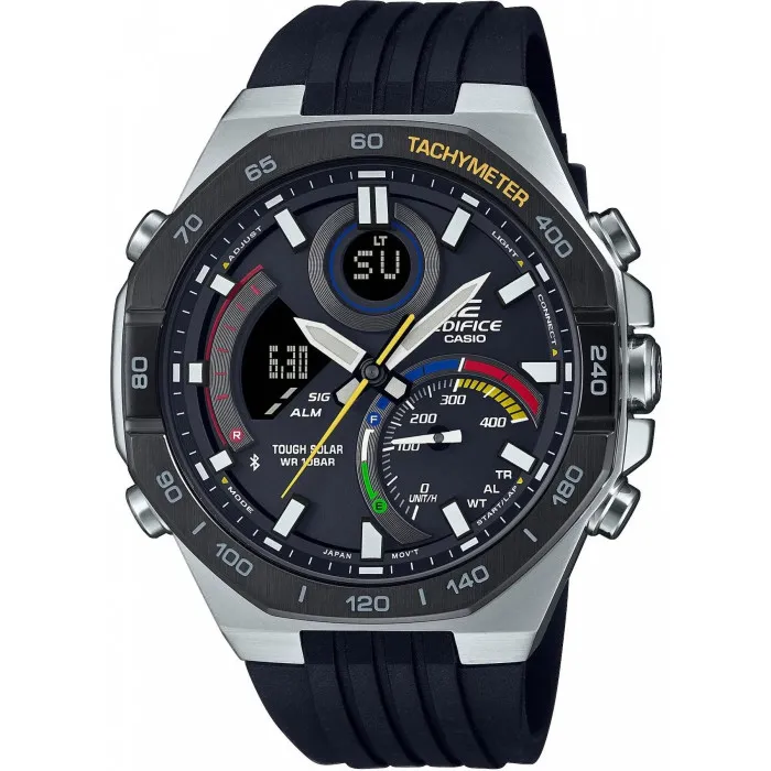 Ervaar de perfecte combinatie van stijl en functionaliteit met de Casio® Analogue-digital 'Edifice' Horloge voor Mannen ECB-950MP-1AEF. Dit opmerkelijke tijdpiece is voorzien van een slank zilveren roestvrijstalen kast, met een diameter van 48 mm en een dikte van 13 mm, elegant gecombineerd met een gedurfde zwarte wijzerplaat. Het horloge toont zowel analoge als digitale functies, waardoor het een essentieel accessoire is voor de moderne man. Uitgerust met een tachymeter bezel, stelt dit horloge je in staat om snelheid bij te houden, terwijl het mineraalglas raam duurzaamheid en duidelijkheid biedt. Het horloge is ontworpen om de dagelijkse slijtage te weerstaan met een waterbestendigheid van tot 10 bar. Comfort ontmoet duurzaamheid met een robuuste zwarte plastic band van 21 cm lang en 23 mm breed. De sluiting met gesp zorgt voor een veilige pasvorm, wat rust geeft tijdens het bewegen. Het horloge beschikt ook over een scala aan functies, inclusief Bluetooth-connectiviteit, solar power, een stopwatch, wereldtijd en alarmfuncties. Of je nu een zakelijke bijeenkomst bijwoont of geniet van een weekendavontuur, de Edifice is afgestemd op alle situaties. Met een gebruiksvriendelijk ontwerp en een professionele uitstraling, belichaamt dit horloge zowel verfijning als praktische toepasbaarheid, waardoor het een ideale keuze is voor mannen die waarde hechten aan stijl en efficiëntie.Koop Casio® Analogue-digital 'Edifice' Horloge voor Mannen ECB-950MP-1AEF bij Ormoda