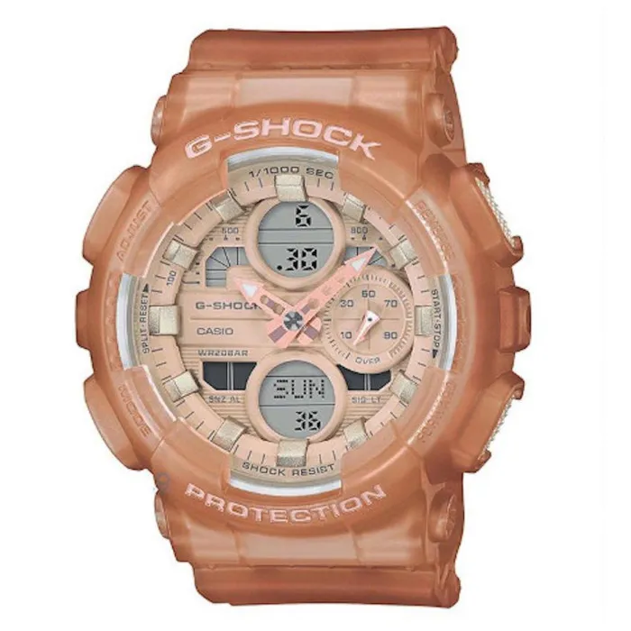 Presenting de Casio® Analoge-digitale 'G-shock' Dameshorloge GMA-S140NC-5A1ER, een perfecte combinatie van stijl en functionaliteit, vervaardigd voor de moderne vrouw. Dit horloge aanvult niet alleen jouw sportieve look, maar belichaamt ook precisie met zijn uitstekende quartzbeweging. De ronde behuizing van kunststof, gekleurd in rijke bruine tint, meet een robuuste 45 mm in diameter en 14 mm in dikte, waardoor het ideaal is voor dagelijks gebruik. De schitterende roze wijzerplaat wordt het opvallende middelpunt, beschermd door mineraalglas dat zorgt voor helderheid en duurzaamheid. De analoge-digitale weergave biedt de veelzijdigheid die je nodig hebt om de tijd bij te houden, ondersteund door functies zoals een stopwatch, countdown-timer, wereldtijd, alarm en licht voor die avonturen met weinig licht. Het horloge bevat ook een dag-datum kalender, waardoor het een betrouwbare accessoire is voor jouw drukke schema. Ontworpen met de actieve vrouw in gedachten, is dit G-Shock-horloge waterbestendig tot 20 bar, zodat je jouw levensstijl zonder zorgen kunt omarmen. De bruine kunststof band, met een lengte van 20 cm en een breedte van 24 mm, is voorzien van een stijlvolle gespsluiting die voor een veilige pasvorm op jouw pols zorgt. Met een gewicht van slechts 54 g vergeet je zelfs dat het er is, totdat je de tijd controleert. De Casio G-Shock is niet zomaar een horloge; het is een statement van veerkracht en stijl, ontworpen om je op koers te houden en fashionable tegelijk. Koop Casio® Analoge-digitale 'G-shock' Dameshorloge GMA-S140NC-5A1ER bij Ormoda