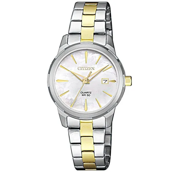 De Citizen® Analogue Women's Watch EU6074-51D is een schitterende weergave van elegantie en functionaliteit, speciaal ontworpen voor de moderne vrouw die stijl en verfijning waardeert. Dit casual horloge beschikt over een prachtig afgerond wijzerplaat gemaakt van glanzend parelmoer, dat een betoverende achtergrond biedt die past bij de slanke zilveren kast. Met een diameter van 28 mm en een slank profiel van slechts 7 mm in dikte, straalt het een zachte vrouwelijke charme uit die perfect is voor dagelijkse draging of speciale gelegenheden. De duurzame roestvrijstalen kast van het horloge verhoogt niet alleen de esthetische aantrekkingskracht, maar garandeert ook een lange levensduur en weerstand tegen slijtage. De multicolor roestvrijstalen band heeft een lengte van 19 cm en toont een harmonieuze mix van tinten die veelzijdigheid viert. Met een breedte van 13 mm is deze stijlvolle band uitgerust met een veilige vouwsluiting en een drukknop, wat comfort en gebruiksgemak biedt. Aangedreven door een betrouwbare quartz beweging, garandeert dit tijdpiece precisie in tijdkeeping, zodat u altijd op schema blijft, waar uw dag u ook brengt. Het horloge beschikt ook over een praktische datumkalender, die doordacht binnen de wijzerplaat is geplaatst voor gemak. Met een indrukwekkende rating van 5 ATM is dit horloge ontworpen om spetters en korte onderdompeling in water te weerstaan, wat gemoedsrust biedt voor dagelijkse activiteiten. Met een gewicht van slechts 60 gram belooft het comfort om de pols, waardoor het een ideale aanvulling op elke sieradencollectie is.