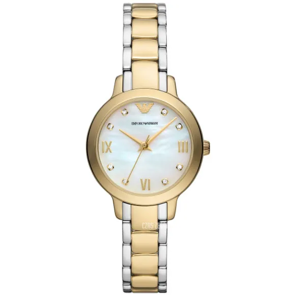 De Emporio Armani® Analogue 'Cleo' Dameswatch AR11513 is een verbluffende vertegenwoordiging van elegantie die de essentie van stijlvolle verfijning vastlegt. Dit voortreffelijke horloge heeft een glanzende parelmoer wijzerplaat die betovert met zijn iriserende glans en een gevoel van tijdloze schoonheid uitstraalt. De ronde kast, gemaakt van hoogwaardig roestvrij staal, heeft een diameter van 32mm, terwijl de slanke dikte van 7mm een delicate moderne touch toevoegt. Het horloge wordt aangedreven door een nauwkeurige quartz beweging, wat zorgt voor betrouwbaarheid en precisie bij elke tik. De gouden kleur van de kast straalt warmte en luxe uit, waardoor het elk outfit moeiteloos naar een hoger niveau tilt. Met een waterbestendigheid tot 5 bar is dit stuk niet alleen mooi, maar ook praktisch, klaar om je te vergezellen van gezellige koffieafspraken tot elegante avondbijeenkomsten. De meerkleurige band toont een uniek ontwerp, vervaardigd uit duurzaam roestvrij staal, dat varieert in kleur en het maakt tot een veelzijdige accessoire voor zowel dag- als nachtgebruik. Met een lengte van 19cm en een breedte van 12mm omarmt de horlogeband comfortabel de pols met een veilige vouwsluiting die gebruiksgemak combineert met een elegante afwerking. De hoogte van 39mm van het horloge zorgt voor een perfecte pasvorm en is geschikt voor diverse polsmaten. Met zijn voortreffelijke ontwerp en fijne vakmanschap voegt het Cleo-horloge een onderscheidende toets van persoonlijkheid en gratie toe aan je horlogecollectie. Dit is niet zomaar een horloge; het is een statementstuk dat de lijn tussen elegantie en casual stijl balanceren, perfect voor de veeleisende vrouw die kwaliteit en esthetische schoonheid waardeert.Koop Emporio Armani® Analogue 'Cleo' Dameswatch bij Ormoda