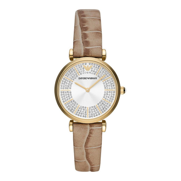 De Emporio Armani® Analogue 'Gianni T-bar' Dameshorloge AR11518 belichaamt prachtig moderne elegantie met zijn chique ontwerp dat perfect is voor de eigentijdse vrouw. Dit verfijnde accessoire heeft een verbluffende ronde kast die is vervaardigd uit hoogwaardig roestvrij staal, wat het een luxueus gevoel geeft. De klassieke gouden kleur van de kast harmoniseert perfect met de zachte zilveren tint van de wijzerplaat, waardoor een tijdloze uitstraling ontstaat die naadloos overgaat van dag naar nacht. Met een kastdiameter van 32mm en een slank profiel van slechts 7mm in dikte, is dit horloge ontworpen om elegant om de pols te zitten, met zowel comfort als verfijning als resultaat. De analoge weergave is beschermd door mineraalglas, wat duurzaamheid garandeert terwijl het een gemakkelijke leesbaarheid biedt. Binnen de delicate kast bevindt zich een betrouwbare quartz beweging, een teken van precisie die bekend staat om zijn nauwkeurigheid. De ingetogen elegantie gaat verder met een brown leren band die de algehele esthetiek aanvult, speciaal ontworpen voor polsen tot 19cm. De gesp sluiting zorgt voor een veilige pasvorm en maakt het gemakkelijk om het horloge aan en uit te trekken. Met een waterbestendigheid tot 3 bar is dit horloge stevig genoeg voor dagelijks gebruik en behoudt het tegelijkertijd een lucht van verfijnde stijl. Of je je nu kleedt voor een speciale gelegenheid of een vleugje luxe aan je dagelijkse outfit toevoegt, het Emporio Armani 'Gianni T-bar' horloge is een essentiële aanvulling op de collectie van elke verfijnde vrouw. De combinatie van functionaliteit en esthetische aantrekkingskracht maakt het niet alleen een horloge, maar ook een statement piece dat de individuele stijl benadrukt.Koop Emporio Armani® Analogue 'Gianni T-bar' Dameshorloge bij Ormoda