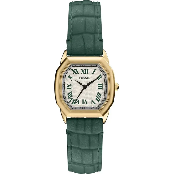 Fossil® Analogue 'Harlow' Dameshorloge ES5427 is een meesterwerk dat elegantie en verfijning combineert met modern design, waardoor het het perfecte accessoire is voor de hedendaagse vrouw. De opvallende octagonale behuizing is prachtig vervaardigd uit roestvrij staal en schittert in een stralende gouden tint die het licht vangt en de aandacht trekt. Met een diameter van 27 mm en een dikte van 8 mm is dit uurwerk zowel stijlvol als comfortabel voor dagelijks gebruik. De crèmekleurige wijzerplaat voegt een tijdloze touch toe, beschermd door een duurzaam mineraal glazen venster, waardoor je de details met helderheid kunt zien. Dit horloge heeft een charmante groene leren band die het ontwerp complementeert. De band is 19 cm lang en 16 mm breed, wat zorgt voor een snug en aanpasbare pasvorm om je pols. De klassieke gesp sluit het horloge op zijn plaats, wat extra gemak biedt. Met een waterbestendigheidsrating van 3 bar kun je het zorgeloos dragen tijdens dagelijkse activiteiten zonder in te boeten op stijl. Of je nu in een professionele setting bent of een casual uitje met vrienden hebt, dit prachtige stuk van Fossil verbetert elke outfit met een vleugje klasse. De Quartz beweging garandeert precisie en betrouwbaarheid, waardoor het net zo functioneel als modieus is. Verhoog je persoonlijke stijl met het Fossil® Analogue 'Harlow' Dameshorloge, een ware veelzijdige aanvulling op je sieradencollectie.