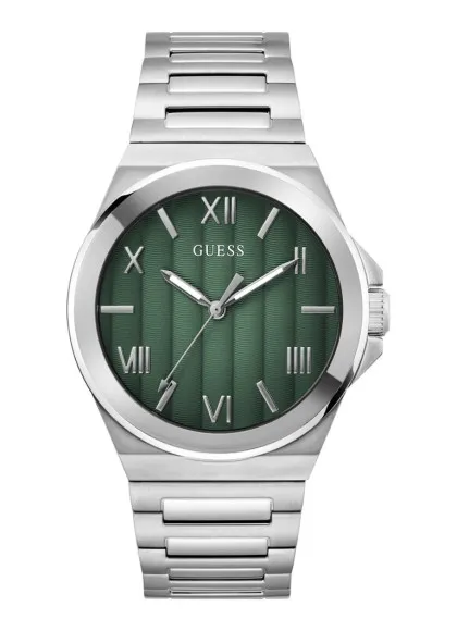 De Guess® Analogue 'Vinyl' Herenhorloge GW0789G1 is een krachtige statement piece, ontworpen voor mannen die stijl en precisie waarderen. Dit zorgvuldig vervaardigde horloge heeft een opvallende groene wijzerplaat die een betoverend contrast vormt met de gepolijste zilveren roestvrijstalen kast. Met een diameter van 44 mm en een slanke dikte van 10 mm, straalt de ronde kast een verfijnde, maar robuuste esthetiek uit. De robuustheid van het horloge wordt versterkt door een mineraalglas venster, dat niet alleen de duurzaamheid waarborgt, maar ook de levendige wijzerplaat in de schijnwerpers plaatst. Dit horloge wordt aangedreven door een nauwkeurige quartz beweging, waardoor je altijd op tijd bent terwijl je er modieus uitziet. De zilveren roestvrijstalen band, met een lengte van 21 cm en een breedte van 24 mm, is vakkundig ontworpen voor comfort en stijl, versierd met een vouwsluiting met drukknop voor een veilige sluiting. De charme van de Guess® Analogue 'Vinyl' gaat verder dan zijn uiterlijk; het is waterbestendig tot 3 bar, waardoor het een veelzijdig accessoire is voor dagelijks gebruik en speciale gelegenheden. Dit horloge belichaamt een hedendaagse geest en is de perfecte aanvulling op zowel casual als formele kleding. Een echte uitdrukking van verfijning en functionaliteit, die mannen in staat stelt om hun stempel te drukken zonder een woord te zeggen.Koop Guess® Analogue 'Vinyl' Herenhorloge bij Ormoda
