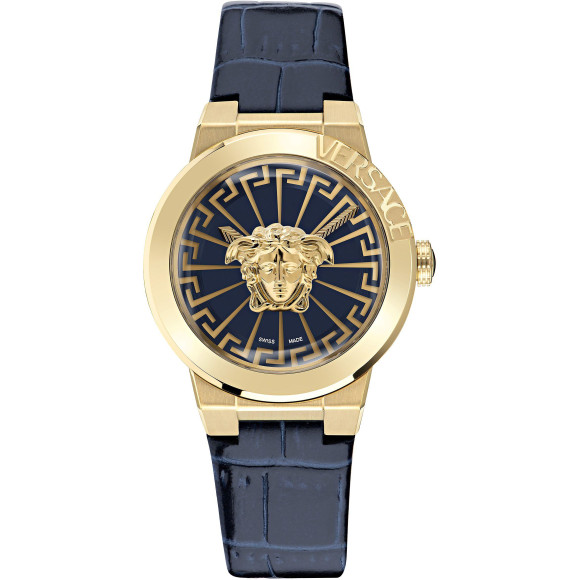 Indulge in de elegantie van de Versace® Analogue 'Medusa Infinite' Dameshorloge VE3F00122, een adembenemende aanvulling op de collectie van elke verfijnde vrouw. Dit voortreffelijke uurwerk combineert moeiteloos luxe en functionaliteit, waardoor het de perfecte accessoire is voor zowel formele als informele gelegenheden. Het horloge beschikt over een opvallende blauwe wijzerplaat die prachtig wordt aangevuld door een gouden roestvrijstalen kast, die een elegante diameter van 38 mm heeft. De verfijnde ronde kast, met een dikte van slechts 11 mm, voegt een delicate toets toe aan uw pols, terwijl het saffierglazen venster duurzaamheid en kristalhelderheid biedt voor optimale zichtbaarheid. Het horloge wordt aangedreven door een nauwkeurige quartzbeweging, wat betrouwbaarheid en precisie belooft, essentieel voor de veeleisende persoon. Dit prachtige uurwerk is omringd door een prachtig ontworpen gouden horlogekast, die het unieke Medusa-embleem tentoonstelt waarvoor Versace beroemd is. De azuurblauwe kleur van de horlogeband, gemaakt van hoogwaardig leer, creëert een chique uitstraling en biedt comfort met een totale lengte van 19 cm en een breedte van 20 mm. Het is beveiligd met een handige vouwsluiting, die zowel functionaliteit als een vleugje verfijning integreert. Dit horloge is ontworpen met veerkracht in gedachten en kan een waterbestendigheid van tot 5 bar weerstaan, waardoor het geschikt is voor dagelijks gebruik en zijn pristine staat behoudt. Of u nu op een gala bent of geniet van een lunch met vrienden, de Medusa Infinite is de belichaming van tijdloze stijl, een echt statementstuk dat Versace's toewijding aan luxueuze vakmanschap en moderne verfijning weerspiegelt.Koop Versace® Analogue 'Medusa Infinite' Dameshorloge bij Ormoda