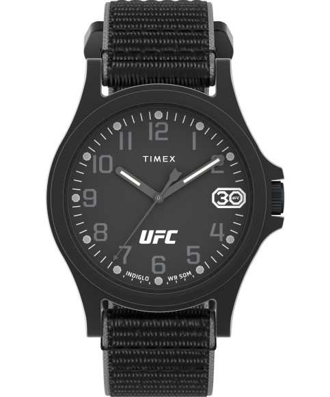 De Timex® Analogue 'Ufc Apex' Mannenhorloge TW2V90800 is de belichaming van robuuste verfijning. Ontworpen voor de moderne man die duurzaamheid waardeert, heeft dit horloge een robuuste zwarte kunststof kast die zowel veerkracht als stijl biedt. De diameter van 40 mm toont een gedurfde ronde wijzerplaat, verfraaid met een slanke zwarte wijzerplaat die beschermd wordt door duurzaam mineralen glas. Dit tijdstuk draait niet alleen om looks; het beschikt over een betrouwbare quartz beweging, die precisie garandeert met elke tik. Het casual ontwerp spreekt een veelzijdige levensstijl aan, waardoor het perfect is voor dagelijks gebruik of speciale gelegenheden. De 20 mm brede zwarte stoffen band, met een comfortabele klittenbandsluiting, omsluit je pols met precies de juiste hoeveelheid stevigheid, terwijl de uitgebreidere lengte van 21 cm zorgt voor de perfecte pasvorm voor elke polsmaat. Met een indrukwekkende waterbestendigheid van 5 bar is de UFC Apex gebouwd om spetters en korte onderdompelingen te weerstaan, zodat je met vertrouwen van je activiteiten kunt genieten. Met een gewicht van slechts 29 gram merk je nauwelijks dat het er is, waardoor het je favoriete horloge wordt voor alle evenementen. De UFC Apex is niet zomaar een horloge; het is een statement van kracht, functionaliteit en klassieke stijl die de levensstijl van elke man aanvult.Over Timex® Analogue 'Ufc Apex' Mannenhorloge TW2V90800