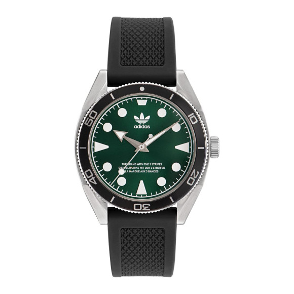 De Adidas Originals® Analogue 'Edition Two' Unisex Watch AOFH23008 is een opmerkelijk stuk, ontworpen om zowel stijl als functionaliteit te bieden. Met zijn opvallende groene wijzerplaat heeft deze klok een ronde behuizing van roestvrij staal, met een diameter van 43 mm en een dikte van 11,28 mm. De pilotenstijl van het horloge is niet alleen visueel aantrekkelijk; het beschikt ook over een draaibare bezel die veelzijdigheid aan het ontwerp toevoegt. Het mineraalglas dat de wijzerplaat bedekt, zorgt voor duurzaamheid, terwijl de silicoenen band van 20 cm lang en 20 mm breed, comfort biedt voor dagelijks gebruik. De band is uitgevoerd in een elegante zwarte kleur die de algehele esthetiek aanvult en sluit veilig met een klassieke gesp.Koop Adidas Originals® Analogue 'Edition Two' Unisex Watch AOFH23008 bij Ormoda