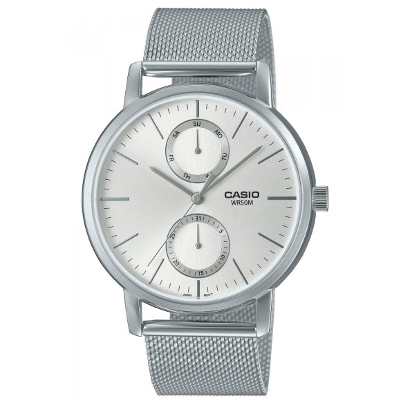 Ervaar de perfecte combinatie van functionaliteit en stijl met de Casio® Multi Dial 'Collection' Herenhorloge MTP-B310M-7AVEF. Dit horloge weerspiegelt de verfijning die vereist is voor de moderne man van vandaag. Een opvallend kenmerk van dit model is de prachtig vervaardigde ronde kast van roestvrij staal. Met een diameter van 40 mm en een dikte van slechts 10 mm, presenteert het een gedurfde maar subtiele aanwezigheid om de pols. De schitterende zilveren kast complementeert de zilverkleurige wijzerplaat, die beschermd wordt door duurzaam mineraalglas. Dit tijdstuk beschikt over een multidiagonaal displaytype, waardoor alle essentiële informatie binnen handbereik is. De praktische dag-datum kalenderfunctie verbetert de bruikbaarheid voor de drukke professional. Het horloge is ook waterbestendig tot 5 bar, waardoor het geschikt is voor dagelijks gebruik en gemoedsrust biedt tegen vochtbeschadiging. De roestvrijstalen band, die zich uitstrekt tot 21 cm met een breedte van 20 mm, is zowel robuust als comfortabel, bevestigd met een vouwsluiting die zorgt voor een stevige pasvorm. Met een gewicht van slechts 81 gram voelt het licht aan op de pols en behoudt het zijn stevigheid. De Casio® Multi Dial 'Collection' is ideaal voor casual wear en kan moeiteloos van dag naar nacht worden gedragen, wat het een veelzijdige aanvulling maakt op de collectie van elke man.Koop Casio® Multi Dial 'Collection' Herenhorloge bij Ormoda