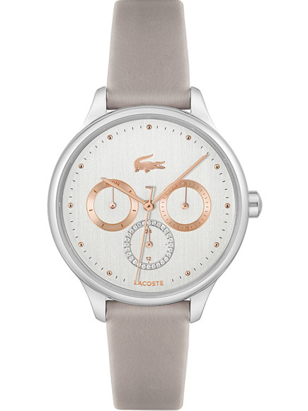 De Lacoste® Multi Dial 'Birdie' Dameshorloge 2001207 is een perfecte mix van elegantie en casual stijl die de moderne vrouw omarmt. Dit prachtig vervaardigde horloge heeft een ronde kast van hoogwaardig roestvrij staal, die schittert in een verfijnde zilveren tint. Met een diameter van 35 mm en een dikte van 9 mm, biedt het de ideale balans tussen aanwezigheid en comfort, waardoor het een uitstekend accessoire is voor iedere gelegenheid. De multi-dial weergave verhoogt niet alleen de visuele aantrekkingskracht, maar biedt ook praktische functionaliteit, zodat je moeiteloos meerdere tijdzones kunt bijhouden. Het zilveren wijzerplaat, beschermd door mineraalglas, voegt een vleugje schittering toe, terwijl de dag-datum kalenderfunctie ervoor zorgt dat je nooit een beat mist in je drukke leven. Het horloge is versierd met een chique grijze leren band van 19 cm lang en 14 mm breed, wat zorgt voor een comfortabele pasvorm om de pols. De gesp sluit het veilig en eenvoudig, zodat je de hele dag van zowel mode als functie kunt genieten. Dit verfijnde horloge heeft bovendien een waterbestendigheid van AT3, waardoor het perfect geschikt is voor dagelijks gebruik en lichte spetters. Met zijn elegante ontwerp en verfijnde kenmerken spreekt het Birdie horloge vrouwen aan die zowel stijl als praktisch nut waarderen. Het is geschikt voor casual uitjes of meer formele evenementen en voegt een vleugje verfijning toe aan elke outfit. Dit horloge is niet slechts een tijdwaarnemer; het is een statementstuk dat je persoonlijkheid weerspiegelt - stijlvol, zelfverzekerd en elegant.Koop Lacoste® Multi Dial 'Birdie' Dameshorloge bij Ormoda