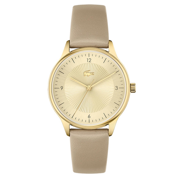 Stap in elegant met het prachtige Lacoste® Analogue 'Club' Dameshorloge 2001167. Dit verfijnde tijdstuk belichaamt niet alleen een stijlvolle uitstraling, maar ook de essentie van moderne vrouwelijkheid. Het horloge is met precisie vervaardigd en beschikt over een luxueuze ronde kast van roestvrij staal, versierd in een verfijnde gouden kleur die warmte en klasse uitstraalt. Met een kastdiameter van 34mm en een dikte van 8mm past dit horloge naadloos om je pols en accentueert het je unieke stijl terwijl het eenvoudig de aandacht trekt. De wijzerplaat toont een prachtige gouden kleur, beschermd door duurzaam mineraalglas, zodat je er altijd verzorgd uitziet met elke blik op je pols. De beige leren band, met een lengte van 19cm en een breedte van 15mm, biedt comfort en verfijning, en zorgt ervoor dat het horloge veilig vastzit met een klassieke gesp voor een perfecte pasvorm. Met een waterdichtheid van 3 bar kun je het vol vertrouwen dragen, of je nu op een informele bijeenkomst bent of een formele gelegenheid bijwoont. De analoge weergave is ontworpen voor degenen die vintage charme combineren met moderne flair. De veelzijdige esthetiek van het horloge zorgt ervoor dat het zowel bij elegante outfits als bij casual kleding past. Het Lacoste® Analogue 'Club' Dameshorloge is niet zomaar een tijdpiece; het is een accessoire dat je dagelijkse look verheft en staat als een bewijs van je uitstekende smaak in mode.Koop Lacoste® Analogue 'Club' Dameshorloge bij Ormoda