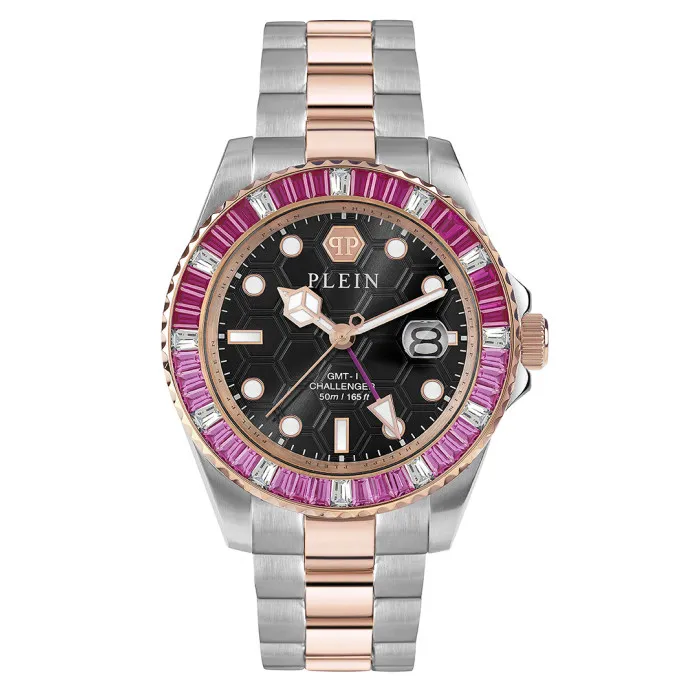 De Philipp Plein® Analogue 'Gmt-i Challenger Baguettes' Herenhorloge PWPZA0424 belichaamt een opvallende combinatie van gedurfde elegantie en verfijning. Met een multikleurige roestvrijstalen kast van 44 mm in diameter, trekt dit horloge meteen de aandacht en maakt het een krachtige impressie. De ronde kast, met een dikte van 11 mm, is niet alleen ontworpen met het oog op esthetiek, maar ook op duurzaamheid, waardoor het bestand is tegen de tand des tijds en de veranderende trends. De kast is vervaardigd uit roestvrijstaal en wordt aangevuld met een schitterende bezel, versierd met verfijnde steen-instellingen, wat de nauwkeurige ambachtelijkheid benadrukt waar Philipp Plein beroemd om is. De opvallende zwarte wijzerplaat trekt de aandacht met zijn strakke ontwerp en praktische functionaliteit. Het beschikt over een datumsysteem voor moderne gebruiksvriendelijkheid, terwijl het mineraalglas venster zorgt voor helderheid en duurzaamheid. Met een robuuste waterbestendigheid tot 5 bar, kan dit uurwerk je in verschillende omgevingen vergezellen, wat het een ideale keuze maakt voor de moderne gentleman. De multikleurige roestvrijstalen band, met een lengte van 21 cm en een breedte van 21 mm, sluit comfortabel om de pols en vergrendelt veilig met een inklapbare sluiting voor gemoedsrust, of je nu aan het werk bent of geniet van je vrije tijd. De kwartsbeweging garandeert nauwkeurige tijdweergave, zodat stijl nooit ten koste gaat van functionaliteit. Met een gewicht van 184 gram biedt dit horloge een perfecte balans tussen aanwezigheid en comfort. Ontworpen voor de man die luxe waardeert en kwaliteit eist, is de 'Gmt-i Challenger Baguettes' meer dan alleen een horloge; het is een statementstuk dat een levensstijl van elegantie en succes belichaamt.