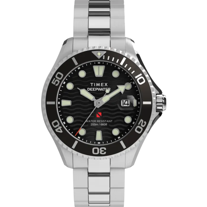 Het Timex® Analogue 'Deep Water Meridian' Herrenhoro TW2W82000 is een waar voorbeeld van gedurfde ontwerpen en opmerkelijke functionaliteit. Dit horloge beschikt over een opvallende zwarte wijzerplaat die wordt benadrukt door luminieuze wijzers, wat uitstekende zichtbaarheid biedt in verschillende lichtomstandigheden. Een opmerkelijke waterbestendigheid tot 20 bar maakt het een betrouwbare metgezel voor het duiken en andere watersporten. Het horloge heeft een band van roestvrij staal die niet alleen de verfijnde esthetiek aanvult, maar ook uitzonderlijke duurzaamheid biedt. Met een verstelbare lengte van 21 cm zorgt de band voor een comfortabele pasvorm voor elke polsmaat. De vouwsluiting met drukknopmechanisme garandeert veiligheid zonder in te boeten op gebruiksgemak. Of u nu een dag aan de oceaan doorbrengt of een zakelijke vergadering bijwoont, de Deep Water Meridian is veelzijdig genoeg om zich aan elke gelegenheid aan te passen. Dit tijdpiece wordt aangedreven door een nauwkeurige quartzbeweging, wat zorgt voor een exacte tijdregistratie in uw drukke dagelijkse routine. Met een gewicht van 180 gram slaat dit horloge een perfecte balans tussen solide vakmanschap en comfortabel dragen, waardoor het een onmisbare aanvulling is op de accessoires van elke moderne man. Geniet van de verfijnde charme en betrouwbaarheid van dit prachtige horloge van Timex, een tijdloos stuk dat uw persoonlijke stijl en robuuste geest belichaamt.