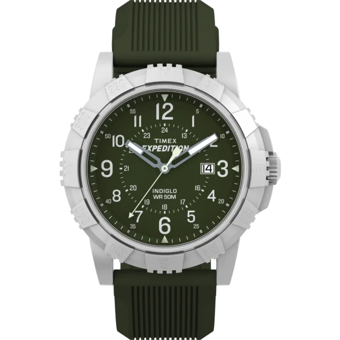 Kennismaking met de Timex® Analogue 'Expedition North Ridge' Mannenhorloge TW4B32100, een horloge dat de geest van avontuur perfect belichaamt. Dit horloge, dat de gerenommeerde Timex-merk vertegenwoordigt, is ontworpen voor degenen die het verkennen, duurzaamheid en betrouwbare prestaties waarderen. Timex is sinds zijn ontstaan een pionier in horlogemakerij, bekend om het creëren van tijdstukken die bestand zijn tegen de uitdagingen van buitensporten, terwijl ze een moderne stijl en functionaliteit behouden. Met een sterke focus op kwaliteit en vakmanschap, belichaamt Timex de ethos van het verkennen van het onbekende en het omarmen van levensreizen. Ontworpen voor mannen die zowel vorm als functie waarderen, valt de Expedition North Ridge op door zijn opvallende groene wijzerplaat, huisvest in een stevige zilveren messing kast van 45mm in diameter. Het horloge is veelzijdig en geschikt voor zowel casual gebruik als robuuste avonturen. De kwartsbeweging garandeert een nauwkeurige tijdsweergave, zodat je altijd op schema bent, of je nu in de vergaderzaal of op het pad bent. De opvallende groene siliconen band voegt niet alleen flair toe, maar zorgt ook voor comfortabel dragen, met een lengte van 21cm en een breedte van 22mm. Deze duurzame band wordt vergrendeld met een traditionele gesp, zodat je verzekerd bent dat hij op zijn plaats blijft, ongeacht waar je avonturen je ook brengen. Met een dikte van 13mm zit dit horloge comfortabel om de pols, terwijl het robuuste ontwerp, met een waterbestendigheidsclassificatie van 5 ATM, dagelijks spatten en korte onderdompelingen in water aankan. Om je goed geïnformeerd te houden, beschikt het horloge over een handige datumkalender die praktisch en stijlvol samenvoegt. Het mineraalglas venster van de wijzerplaat is krasbestendig en verbetert de leesbaarheid, wat het een essentiële metgezel maakt voor de moderne man. De Expedition North Ridge is meer dan alleen een horloge; het is een statementstuk dat je actieve levensstijl en verfijnde smaak weerspiegelt. Koop Timex® Analogue 'Expedition North Ridge' Mannenhorloge bij Ormoda