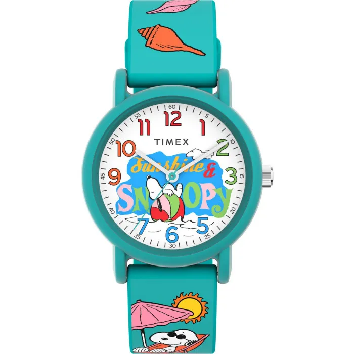 De Timex® Analogue 'Peanuts Weekender Color Rush' Kinderwatch TW2V78500 belichaamt de vrolijke essentie van de kindertijd. Met een levendige combinatie van kleuren en een speels ontwerp is deze watch perfect voor kleine kinderen die hun persoonlijkheid op een leuke manier willen uitdragen. Met karakters uit de geliefde Peanuts-strips, zorgt elke blik op de pols voor een glimlach, waardoor het niet alleen een tijdpiece is, maar ook een gewaardeerde accessoire. Ontworpen voor unisex gebruik, is het ideaal voor kinderen die een casual maar stijlvolle watch waarderen. De kunststof behuizing heeft een diameter van 36mm en een dikte van 8mm, wat zorgt voor duurzaamheid terwijl het lichtgewicht blijft, zodat kinderen zich nooit belast voelen. De spetter groene kleur van de behuizing en band versterkt zijn speelse karakter, terwijl de multicolor wijzerplaat schitterend alle fantasierijke karakters toont waar jonge fans dol op zijn. Aangedreven door een betrouwbare quartz beweging, weerspiegelt deze watch de toewijding van Timex aan kwaliteit, wat zorgt voor nauwkeurige tijdsaanduiding tijdens alle avonturen van een kind. Het mineraalglas biedt sterke bescherming tegen krassen, waardoor de uitstraling van de watch behouden blijft, zelfs na de meest wilde speelsessies. De 20 cm lange siliconenband met een comfortabele breedte van 17 mm is eenvoudig aan te passen voor een perfecte fit, wat het een fluitje van een cent maakt voor ouders en kinderen. Met een waterbestendigheid van 3 bar kan deze watch spetters aan, wat ouders gemoedsrust geeft terwijl kinderen hun activiteiten zorgeloos kunnen genieten. Iedereen zal het levendige ontwerp waarderen dat kinderen aanmoedigt om op stijlvolle wijze de tijd te verkennen.Koop Timex® Analogue 'Peanuts Weekender Color Rush' Kinderwatch bij Ormoda