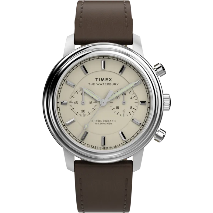 Timex® Chronograph 'Waterbury Metropolitan' Herenhorloge TW2Y23500 is een ultieme belichaming van klassieke ontwerpen en moderne efficiëntie. Deze horloge mengt functionaliteit naadloos met stijl en is de perfecte keuze voor de veeleisende man. De robuuste quartz beweging biedt betrouwbaarheid en nauwkeurigheid, zodat je altijd op tijd bent, ongeacht de gelegenheid. Vakkundig vervaardigd met een prachtig ronde kast van roestvrij staal, straalt de zilveren kleur een gevoel van verfijning uit dat zowel formele als casual kleding aanvult. Met een diameter van 41mm is het horloge aanzienlijk maar comfortabel om te dragen, wat de ideale balans voor dagelijks gebruik creëert. De roomkleurige wijzerplaat voegt warmte en uniciteit toe, en vormt een zachte tegenstelling met het roestvrij staal. Het mineralen glas beschermt tegen krassen terwijl het een helder zicht biedt op de ingewikkelde chronograaf functies. Met een waterbestendigheid van 5 bar, ziet dit horloge er niet alleen goed uit, maar is het ook ontworpen om verschillende omgevingen te doorstaan, wat gemoedsrust biedt, of je nu op kantoor bent of geniet van buitenactiviteiten. De authentieke bruine leren band brengt een vleugje landelijke elegantie, perfect passend bij de algehele esthetiek. Met een lengte van 21cm en een breedte van 20mm is deze band op comfort afgestemd, beveiligd met een betrouwbare klapsluiting die zorgt voor een veilige pasvorm. Met een gewicht van slechts 70 gram is de Timex Chronograph 'Waterbury Metropolitan' verrassend licht, waardoor het een ideale metgezel is voor een hele dag dragen. Met een hoogte van 47mm van lug tot lug zit het horloge comfortabel om de pols, en creëert het een perfecte silhouet dat zowel functioneel als modieus is.