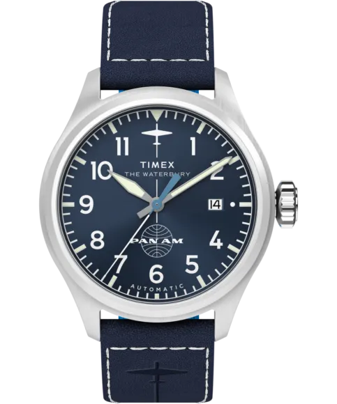 De timex waterbury x pan am tw2y38800 voor heren is uitgerust met een automatisch uurwerk en een rvs kast. De blauw wijzerplaat is gehuisvest in een zilverkleurig gekleurde kast en een blauw leer band. Het horloge wordt geleverd in een originele doos en heeft een garantie van 2 jaar.