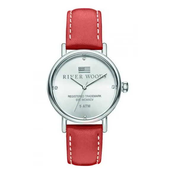 Experience the elegance of time with the River Woods Analogue 'Arkansas' Women's Watch RW340039. This exquisite timepiece is crafted for the discerning woman who values both style and substance. Boasting a sleek, round case made of radiant stainless steel, this watch features a classic silver dial that effortlessly complements a variety of outfits. The quartz movement ensures precision and reliability, making it not just a beautiful accessory, but also a functional timekeeper that you can rely on day after day. The striking red leather band is both eye-catching and comfortable, designed to fit a wrist length of 19 centimeters. With a band width of 14 millimeters, it adds a touch of vibrant elegance that stands out yet remains sophisticated. The buckle clasp ensures that your watch stays securely in place, allowing you to wear it with confidence. With an impressive water resistance of up to 5 bars, you can wear this timepiece during your daily activities without worry. At a case thickness of only 9 millimeters, it sits comfortably on your wrist without being overly bulky, making it perfect for everyday wear or special occasions. The mineral glass window adds durability while maintaining a stunning clarity that lets the watch face shine. This River Woods watch is not merely an accessory; it’s a statement piece that reflects your personal style and sophistication. Elevate your accessories collection with the Arkansas women's watch, where timeless elegance meets contemporary design, adding a splash of color to every ensemble.Shop River Woods RW340039 at Ormoda