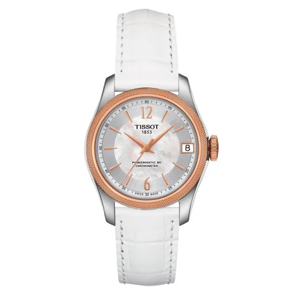 Discover the exquisite charm of the Tissot® Analogue 'Ballade' Women's Watch T1082082611700. This stunning timepiece is more than just a watch; it is an expression of elegance and sophistication designed specifically for the modern woman. Crafted by Tissot, a brand renowned for its commitment to quality and precision since 1853, the Ballade is a testament to luxury fused with functionality. The round case elegantly showcases a mother-of-pearl dial, bringing to life a dance of iridescent colors that shimmer with every glance. The sapphire glass offers a remarkable clarity and scratch resistance, ensuring your watch remains as beautiful as the day you first wore it. With a 30mm diameter, the stainless steel case is both lightweight and durable, making it an ideal choice for daily wear or special occasions. The watch features an automatic movement that ensures accurate timekeeping, merging traditional craftsmanship with contemporary design. Practical features such as a date function and a water resistance of up to 5 bars add to the daily usability of this elegant accessory. The watch is beautifully complemented by a soft white leather band that measures 19cm in length and 15mm in width, providing both comfort and style. The deployment clasp ensures a secure fit while maintaining an effortlessly chic look as you transition from day to night. Perfectly designed for those who appreciate the exquisite nuances of high-quality timepieces, this watch will surely become a cherished part of your jewelry collection.Shop Tissot T1082082611700 at Ormoda