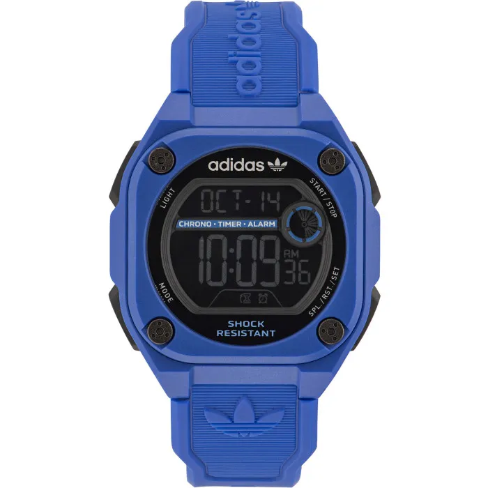 Introducing the Adidas Originals® Digital 'City Tech Two' unisex watch, AOST23061, a perfect blend of style and functionality. Designed for the sporty individual, this timepiece stands out with its vibrant blue resin case. With a case diameter of 45mm and thickness of 15mm, it is comfortably designed to suit any wrist. The round case houses a striking black dial, safeguarded by scratch-proof sapphire-coated glass, ensuring that your watch remains pristine no matter your activities. The digital display offers an array of features that make it versatile for all occasions. Equipped with a calendar that displays day-date, you’ll stay organized and punctual. The watch also boasts extra features like a stopwatch, countdown timer, alarm, dual-time display, and a light function, making it an ideal companion whether you are training for your next marathon or simply monitoring your daily activities. The blue plastic band enhances durability while providing a comfortable fit, measuring 20cm in length and 22mm in width. It is secured with a reliable buckle clasp, ensuring it stays snugly on your wrist. With an impressive water-resistance rating of 10 bars, this watch is ready to endure splashes and rain, making it perfect for both casual outings and intense workouts. Weighing just 56 grams, the Adidas Originals® Digital 'City Tech Two' merges convenience with style, making it a must-have accessory for any modern lifestyle.Shop Adidas Originals AOST23061 at Ormoda
