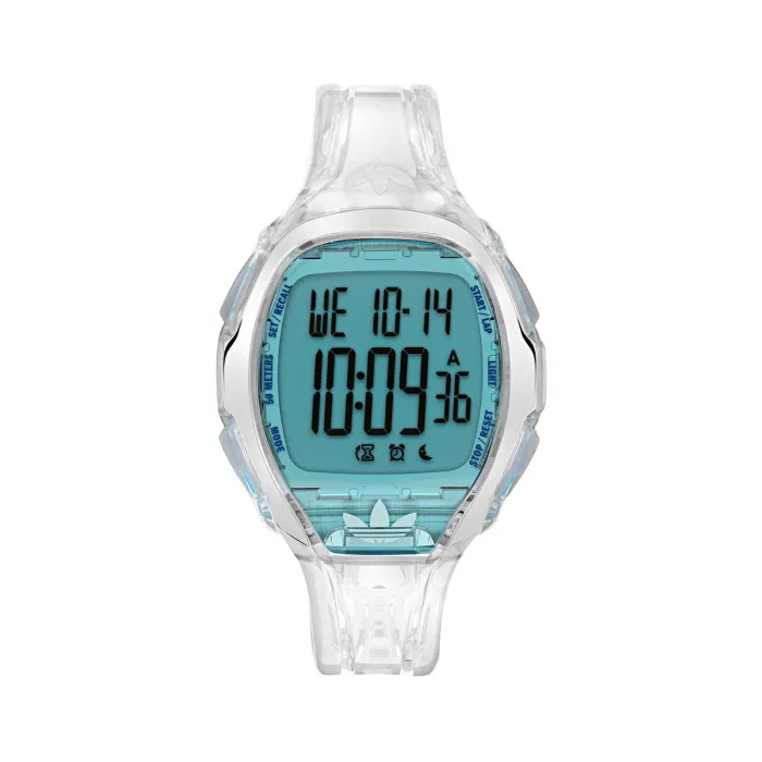 The Adidas Originals® Digital 'Athletics One' Unisex's Watch AOFH25003 stands as a beacon of contemporary design and practicality, ideal for those who are constantly on the move. With its striking blue dial, this watch not only offers exceptional readability but also showcases a modern aesthetic that appeals to anyone aiming for an active lifestyle. The watch has a sturdy yet lightweight design, crafted from durable resin, which contributes to its robust feel while ensuring it can withstand daily wear and tear. The transparent case gives the watch an appealing edge that simulates a sense of lightness and modernity. With a diameter of 45mm and a thickness of 12.5mm, it’s perfectly sized for a range of wrist sizes, ensuring comfort throughout the day. The transparent plastic band is both stylish and functional, measuring 20cm in length and 20mm in width, with a secure buckle clasp that provides a customized fit. This watch goes beyond mere timekeeping; it includes essential features such as a stopwatch, countdown timer, an alarm, and an illuminating light for enhanced usability in various conditions. Water-resistant up to 10 bars (100 meters), the Adidas Originals Athletics One is perfect for enduring gym sessions or swim outings without a worry. The digital display ensures you can see the time and features clearly when you're busy. This watch seamlessly marries sophistication with sports functionality, making it an ideal companion whether you're engaging in a workout session or enjoying a casual outing. Elevate your daily gear with a watch that complements both your style and awe-inspiring active lifestyle.Shop Adidas Originals AOFH25003 at Ormoda