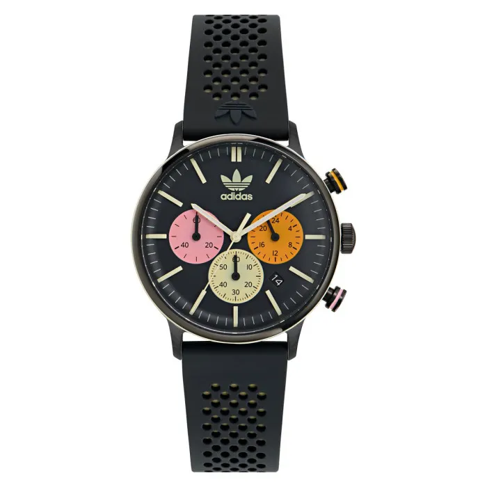 Experience the dynamic look and superior performance of the Adidas Originals® Chronograph 'Code One Chrono' Unisex's Watch AOSY24084. This remarkable timepiece is designed for individuals who live life on the move and appreciate both functionality and style. The watch features a robust black stainless steel case that enhances its sporty aesthetics while ensuring durability. It boasts a 40mm round dial adorned with vibrant multicolored details, making it not just a watch, but a statement piece as well. The mineral glass window provides clarity and scratch resistance, safeguarding the intricate design beneath. The quartz movement ensures precise timekeeping, while the chronograph display adds practicality for those who enjoy tracking time intervals during workouts or daily activities. The date calendar feature eliminates the hassle of manually tracking the day. For added comfort, the silicone band is both lightweight and flexible, measuring 20cm in length and 18mm in width, ensuring a secure fit on any wrist. Designed for an active lifestyle, the watch offers a water resistance rating of 5 bars, making it suitable for splashes and brief immersions without worry. With a case thickness of 10mm and a lug-to-lug height of 46mm, this unisex watch strikes the perfect balance between a sporty watch and a chic accessory. Weighing only 59 grams, it feels light on your wrist, allowing you to focus on your activities without any distractions. Whether you're hitting the gym or dressing up for a night out, the Adidas Originals® Chronograph 'Code One Chrono' Unisex's Watch elegantly fits all occasions.Shop Adidas Originals AOSY24084 at Ormoda