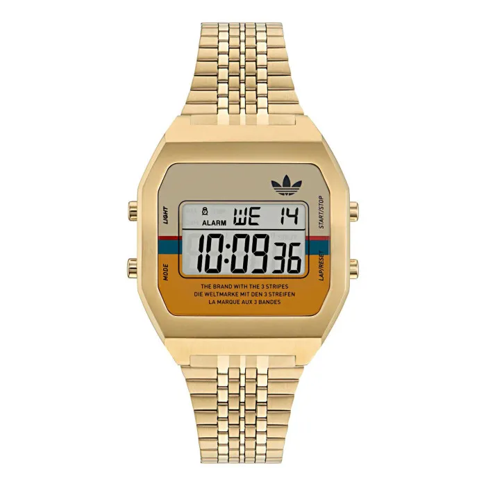 The Adidas Originals® Digital 'Digital Two' Unisex's Watch AOST23555 blends functional design with contemporary style. This remarkable timepiece features a striking square case crafted from durable stainless steel that showcases a radiant gold tone. With a case diameter of 36mm and a thickness of just 10mm, it presents a sleek profile perfect for both casual and semi-formal occasions. The watch boasts a multicoloured dial with a mineral glass window, offering clarity and resilience while adding a vibrant touch to your wrist. Designed for both him and her, it fits seamlessly into any wardrobe, making it a versatile choice for various styles. Equipped with precise quartz movement, this watch ensures accurate timekeeping every day. The digital display includes additional functionalities such as a stopwatch, countdown timer, alarm, and light settings, catering to an active lifestyle. Its day-date calendar feature keeps you organized while you enjoy all of life’s adventures. The watch is also water-resistant up to 5 ATM, making it suitable for daily wear and occasional splashes. The Adidas Originals Digital Two is paired with a robust gold stainless steel band, measuring 20cm in length and 19mm in width, secured with a reliable folding clasp. Whether you are hitting the trails or heading to a casual get-together, this watch not only elevates your style but also provides practical features that assist you throughout your day. Its weight of 89 grams ensures comfortable wear on any occasion, allowing you to express yourself effortlessly with this statement piece.Shop Adidas Originals AOST23555 at Ormoda
