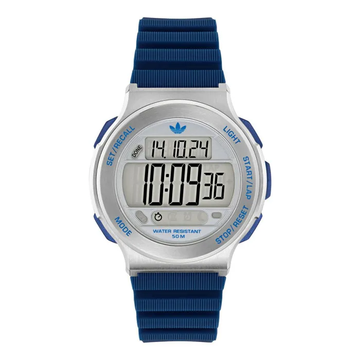 The Adidas Originals® Digital 'Expression Three Digital' Unisex's Watch AOFH25508 embodies a perfect blend of style and functionality. Sporting a striking silver stainless steel round case, this watch is designed for every occasion, reflecting the sporty yet chic essence of the Adidas Originals brand. Measuring 44mm in diameter and 11mm thick, it boasts a lightweight construction with a weight of just 75 grams, ensuring comfort on your wrist all day long. The LCD dial, protected by durable mineral glass, showcases a modern digital display that is simple to read, making it both practical and stylish. This unisex watch comes with a vibrant blue silicone band that not only adds a pop of color but also provides a secure and comfortable fit with a length of 20cm and a width of 21mm. A reliable buckle clasp guarantees that your watch stays in place, whether you are hitting the gym or heading out for a casual outing. Designed for convenience, the watch features several additional functions including a stopwatch, countdown timer, alarm, and a light, making it suitable for the dynamic lifestyle of today's consumers. Worried about durability? The 'Expression Three Digital' is rated for water resistance up to 5 bars, meaning you can wear it without concern during your daily activities or light swimming. This watch is not just a timepiece, but a stylish companion that adapts to your needs, letting you express your individuality with confidence. Shop Adidas Originals AOFH25508 at Ormoda