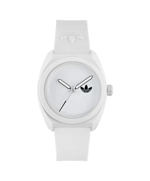 Introducing the Adidas Originals® Analogue 'Project Three' Unisex's Watch AOST24548, a timepiece that blends athletic spirit with contemporary design. Adidas Originals, known for its commitment to high-performance and stylish products, has excelled in creating this versatile watch that seamlessly fits into both casual and active lifestyles. Wearing a watch from this brand is not just about keeping time; it's about embracing a lifestyle rooted in sport and individuality. This elegant piece reflects the innovative aesthetics that fans of the brand have come to appreciate, making it suitable for anyone who values quality and trend. The watch features a robust quartz movement that ensures precise timekeeping. The round case measures 42mm in diameter with a thickness of 11mm, crafted from durable ceramic, giving it a modern and sleek appearance. The stunning white case is complemented by a matching white dial, providing a fresh and clean look. The dial is protected by mineral glass, ensuring durability and resistance to scratches. To further enhance its practicality, the watch is designed with a water resistance of up to 5 bars, making it suitable for everyday wear. Its band, also in white, is crafted from plastic, offering both comfort and flexibility for diverse activities. With a length of 20cm and a width of 20mm, the band includes a secure buckle clasp that ensures a perfect fit for any wrist. The overall weight of the watch is a lightweight 47g, making it comfortable to wear throughout the day. With its blend of style and functionality, the Adidas Originals® Analogue 'Project Three' watch is a must-have accessory for anyone looking to elevate their daily outfits. Shop Adidas Originals AOST24548 at Ormoda