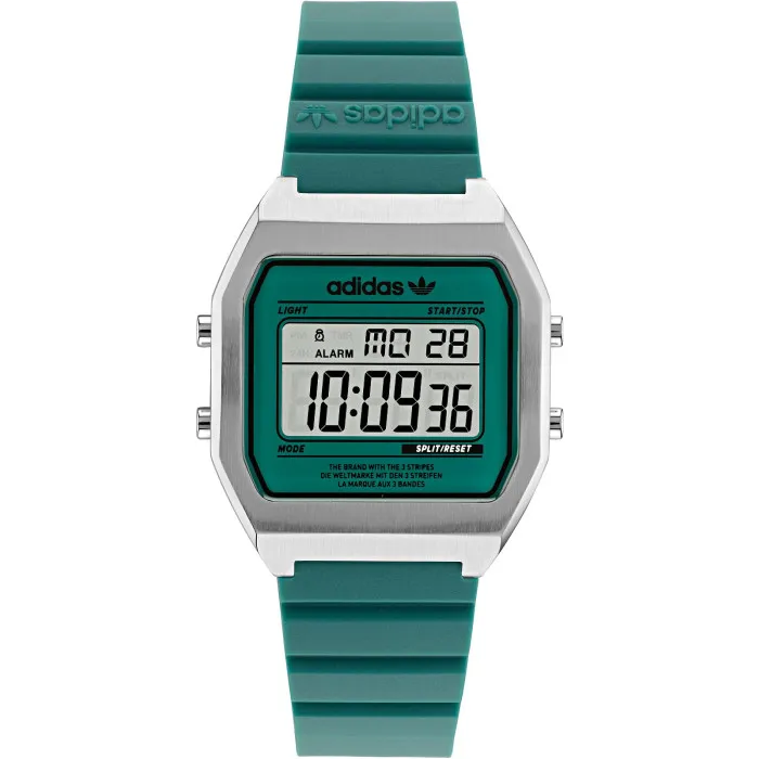 The Adidas Originals® Digital 'Street Digital Two' Unisex's Watch AOST22076 embodies the spirit of urban functionality combined with modern style. Crafted by the renowned Adidas Originals brand, this watch stands out with its vibrant green dial and robust stainless steel casing. Its rectangular shape is not just a design choice but an ergonomic one, providing comfort along with contemporary flair. The watch's quartz movement ensures precise timekeeping, making it a reliable accessory for everyday use. Despite its bold colors, the watch retains a casual elegance suitable for various occasions, from sports activities to casual outings with friends. The 20cm plastic band enhances comfort on your wrist with its lightweight design, while the digital display features including a stopwatch, countdown timer, alarm, and even a light add a layer of practicality for those always on the go. The watch can resist water up to 5 bars, making it suitable for daily wear under light rain. Its day-date calendar function keeps you organized, while the resilient mineral glass dial window provides protection against scratches and impacts. Whether you're hitting the gym or exploring the city, this timepiece is designed to keep up with your lifestyle. With its vibrant aesthetic and practical features, the Adidas Originals Digital 'Street Digital Two' is a must-have addition to any watch collection.Shop Adidas Originals AOST22076 at Ormoda
