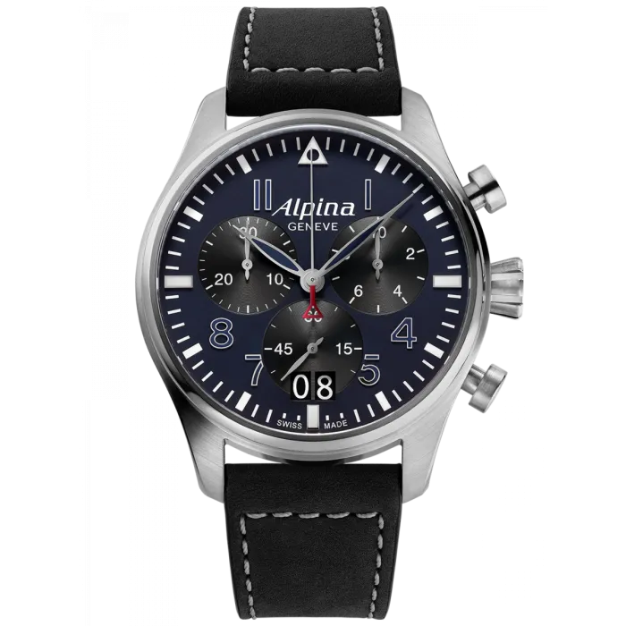 Alpina is renowned for its impeccable craftsmanship and dedication to precision, particularly in the realm of aviation-inspired timepieces. Founded in 1883, this esteemed Swiss brand has consistently combined traditional watchmaking techniques with advancements in technology to create watches that not only look sophisticated but also perform flawlessly. Each Alpina watch is a testament to the brand’s commitment to quality and innovation, designed to meet the needs of discerning individuals who value both style and functionality. The incorporation of aviation into their designs generates a sense of adventure, inviting wearers to chase new heights. Alpina's focus on robust yet elegant designs ensures that every timepiece is an ideal fit for those who lead an active lifestyle without compromising on sophistication. This watchmaker has a rich heritage of creating reliable pilot watches, making them a trusted choice for adventurers and professionals alike. With a reputation for excellence and a dedication to enhancing the user experience, Alpina continues to rise above the standards of modern horology.Introducing Alpina® Chronograph 'Startimer Pilot' Men's Watch AL-372NB4S6
