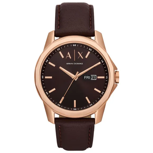 Presenting the Armani Exchange® Analogue 'Banks' Men's Watch AX1740, a distinguished piece that effortlessly elevates any man's style. With a striking rose gold case that measures 44mm in diameter, this watch defines sophistication. Crafted from high-quality stainless steel, the watch case is not only aesthetically pleasing but also durable, ensuring lasting performance. The round design is complemented by a sleek brown dial, protected by resilient mineral glass which provides clarity and resilience against daily wear. The day-date feature enhances practicality, allowing you to keep track of your busy schedule seamlessly. The leather strap adds a touch of classic elegance while ensuring comfort with its 21cm length and 22mm width. The warm brown hue of the band perfectly pairs with the rose gold case, creating a timeless blend that can be dressed up or down depending on the occasion. With a thickness of 11mm, the watch sits comfortably on the wrist without being overpowering, making it an ideal choice for both casual outings and formal events. A water resistance rating of 5 bars means that the Armani Exchange Banks watch is equipped to handle daily splashes and brief immersions, making it perfect for the modern man on the go. Weighing in at 75 grams, it feels substantial without being heavy, allowing for all-day wear. With its exquisite design and thoughtful functionality, the Armani Exchange Analogue 'Banks' Men's Watch AX1740 is more than just a timepiece; it’s a statement of style and refinement.