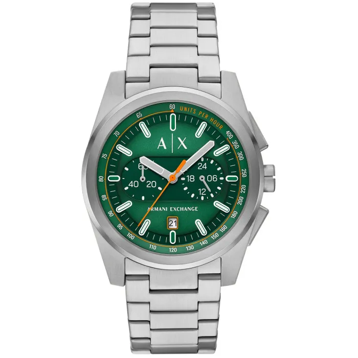 Experience precision and style with the Armani Exchange® Chronograph 'Parker' Men's Watch AX2862. This striking timepiece is a perfect blend of functionality and elegance, designed for the modern man who appreciates a sophisticated aesthetic. The watch features a vibrant green dial that stands out against the gleaming silver of the stainless steel case and band, allowing you to express your individuality while being impeccably stylish. With a case diameter of 44mm and a thickness of 11mm, this watch makes a statement on any wrist. Its round case style is complemented by a durable mineral glass window, ensuring that the allure of the watch is safeguarded against the rigors of everyday life. The quartz movement guarantees precise timekeeping, and with a water resistance of 5 bars, the Parker is more than ready for any adventure, whether in the boardroom or by the water. A convenient date calendar is seamlessly integrated into the design, adding another layer of functionality. The fold-over clasp with a push-button adds a touch of refinement while ensuring the watch stays securely on your wrist. With a band length of 21cm and a width of 21mm, it offers both comfort and elegance for every occasion.
