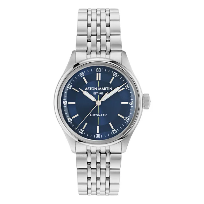 Introducing the Aston Martin® Analogue 'Timeless Ts1' Men's Watch MTTS1S603—a masterful creation that harmonizes style and functionality. This exquisite timepiece showcases a silver stainless steel case that perfectly complements its striking blue dial, making a bold statement suitable for any occasion. Measuring 39mm in diameter and 14mm in thickness, this watch is designed for men who appreciate precision and elegance. Its automatic movement ensures reliable timekeeping, while the mineral glass dial window offers exceptional clarity and protection. The deployment clasp secures the silver stainless steel band, which measures 21cm in length and 19mm in width, providing a comfortable fit on any wrist. With a water resistance of up to 10 bars, this watch is built to endure everyday challenges without compromising its integrity. Whether for business meetings or evening engagements, the Timeless Ts1 is more than a mere accessory—it's a reflection of what you value. Make it a centerpiece in your collection and elevate your style with this testament to luxury and innovation.Introducing Aston Martin® Analogue 'Timeless Ts1' Men's Watch MTTS1S603