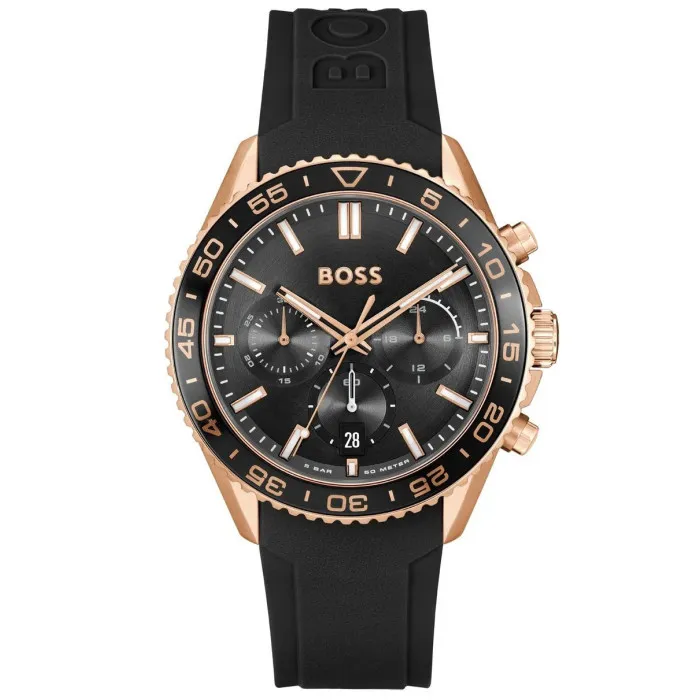 Introducing the Hugo Boss Chronograph 'Runner' Men's Watch 1514168, where luxury meets functionality for the modern man. This sophisticated timepiece boasts a striking gold stainless steel case with a round design, measuring 43mm in diameter and 11mm in thickness, perfectly complementing its tough silhouette. The black dial, protected by durable mineral glass, showcases luminous hands and numbers for enhanced readability, making it as practical as it is stylish. With a date display and a turnable bezel, this watch embodies versatility, suitable for both casual outings and formal occasions. Designed for the contemporary gentleman, the watch features a robust silicone band in black that measures 21cm in length and 21mm in width, fitting comfortably on the wrist while providing a sporty touch. The buckle clasp ensures a secure fit, allowing you to wear it with confidence. Engineered with a quartz movement and equipped with a chronograph display, this watch allows you to track time with precision. Additional features include a stopwatch function and a 24-hour display setting, making it an ideal companion for both day-to-day use and adventurous experiences. With a water resistance rating of 5 bars, the Hugo Boss Chronograph 'Runner' is built to withstand the elements, affirming its commitment to quality and durability. Weighing only 86 grams, this watch is lightweight yet robust, ensuring comfort throughout the day. This is not just a watch; it's a statement piece that reflects your lifestyle, ambition, and taste. Experience the blend of elegance and functionality with the Hugo Boss Chronograph 'Runner' Men's Watch. Shop Hugo Boss 1514168 at Ormoda