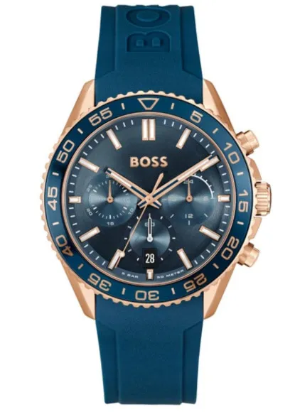 The Hugo Boss® Chronograph 'Runner' Men's Watch 1514169 is a stunning representation of modern luxury crafted for the discerning gentleman. With a striking gold stainless steel case that measures 43mm in diameter and 11mm in thickness, this timepiece is designed to stand out while providing superior durability. The round case style complements the bold blue dial, which is protected by mineral glass, ensuring you can admire its exquisite design without worry. Beneath the surface, the precise quartz movement guarantees that you will always be on time for your next appointment. A standout feature of this watch is its turnable bezel, allowing you to track elapsed time with precision. The chronograph display offers additional functionality, making this timepiece perfect for those who lead a dynamic lifestyle. The luminous hands and numbers ensure readability even in low-light conditions, a testament to its thoughtful design. The date calendar function adds practicality, making this watch suitable for a variety of occasions. Designed for comfort and style, the silicone watch band in matching blue not only provides a secure fit but also measures an impressive 21cm in length and 21mm in width. The durable buckle clasp ensures ease of use while adding an element of sophistication to the overall aesthetic. This watch is water-resistant up to 5 bars, allowing you to wear it confidently during everyday activities. The intelligent combination of style, functionality, and quality makes the Hugo Boss® Chronograph 'Runner' a must-have accessory for any modern man.