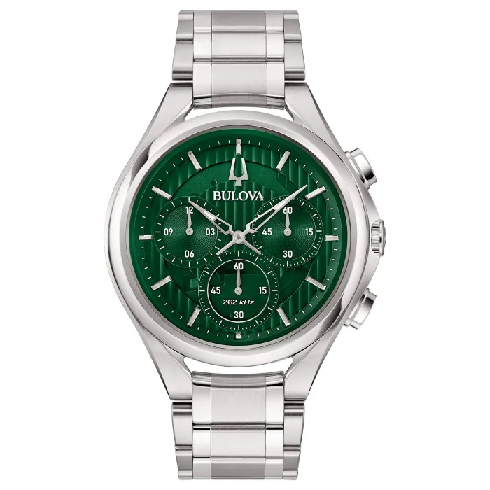 The Bulova® Chronograph 'Curv' Men's Watch 96A297 is a stunning reflection of modern engineering and classic elegance, crafted specifically for the discerning gentleman. Boasting a sophisticated round case made of durable stainless steel, this watch features a sleek silver hue that perfectly complements its rich green dial. At 44mm in diameter and with a thickness of just 11mm, it strikes the perfect balance between boldness and understated refinement. Encased under sapphire glass, the intricate details of the dial are protected while offering exceptional clarity and scratch resistance. What truly sets this timepiece apart is its unique chronograph display, allowing you to measure time with precision. The sophisticated movement is powered by quartz technology, ensuring reliability and accuracy. The deployment clasp provides a secure fit, while the stainless steel band, measuring 21cm in length and 21mm in width, adds to the watch's rugged yet refined appeal. With a water resistance of up to 3 bars, the watch is functional for everyday wear and casual outings. Lightweight yet substantial at 154 grams, the Bulova Curv radiates confidence. Its lug-to-lug height of 52mm ensures a comfortable fit on the wrist, making it suitable for a variety of occasions. Whether you're in a business meeting or enjoying a weekend adventure, this watch is designed to keep up with your lifestyle, embodying both style and practicality. Experience the artistry behind Bulova and elevate your accessory collection with a watch that seamlessly marries luxury and functionality. A perfect companion for the modern man, this timepiece is not just an accessory but a statement.Shop Bulova 96A297 at Ormoda