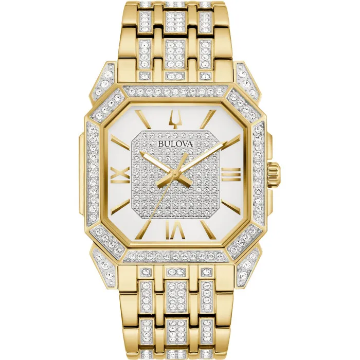Introducing the Bulova® Analogue 'Octava' Men's Watch 98A295, a distinguished timepiece that exudes confidence and sophistication. Tailored for the modern man, the Octava combines the traditional art of watchmaking with contemporary refinement. Fashioned with a masculine touch, this watch lends a professional yet friendly demeanor to its wearer, suited for both office environs and social gatherings. The Octava is a brilliant expression of Bulova's watchmaking prowess. Encased in a lustrous 40mm gold-colored square stainless steel case, the watch reveals a silver dial that graces the wrist with an air of luxury. The stone settings on the bezel accentuate its elegance, while the mineral glass provides durability and luster. Its precise quartz movement ensures unwavering reliability, a hallmark of Bulova's commitment to excellence. The gold-tone stainless steel band measures 21cm in length and 23mm in width, securing comfortably with a deployment clasp. With a 9mm thickness, the case rests upon the wrist with a stately presence. The Octava watch is not just about appearance; its functionality is exemplified with a 3 bars water resistance, ensuring resilience against everyday encounters with water. Peek through its analogue display to navigate through your day with grace and punctuality. The Octava has a 47mm lug to lug height, completing its robust yet refined stature, making it an exemplary choice for the discerning gentleman.Shop Bulova 98A295 at Ormoda