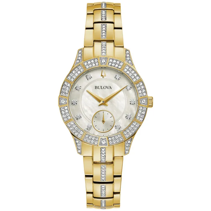 Discover the enchanting elegance of the Bulova® Analogue 'Phantom Crystal' Women's Watch 98L283, a timepiece that celebrates the convergence of artistry and functionality. This exquisite watch is a showstopper with its alluring gold-tone stainless steel framework, punctuated by a symphony of crystal accents that dance with light. The watch's round 31mm case elegantly cradles a mesmerizing mother of pearl dial, protected by scratch-resistant mineral glass that safeguards the face beneath. Each hour is marked with sophistication, courtesy of the watch's stone settings that exude an air of regal charm. The Phantom Crystal's seamless movement is powered by a reliable Quartz mechanism, ensuring that every second is captured with precision. At 8mm in thickness, the case presents a svelte profile perfect for adorning slender wrists, while the 19cm band length and 13mm band width offer a comfortable and customized fit. This watch stands as a paragon of dress watch style, making it the quintessential accessory for formal occasions. Secured with a fold over with push button clasp, it pledges both safety and ease of wear. Designed to withstand the pressures of daily wear, the watch boasts a water resistance of up to 3 bars, encapsulating luxury with resilience. A testament to Bulova's commitment to superior artisanship and aesthetic appeal, the Phantom Crystal is a beacon of femininity and professionalism that resonates with the contemporary woman who appreciates a touch of luxury in her everyday life.Shop Bulova 98L283 at Ormoda
