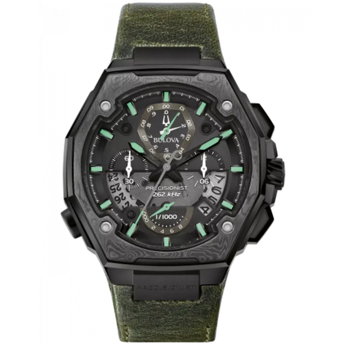 Introducing the Bulova® Chronograph 'Precisionist X Special Edition' Men's Watch 98B355, a stunning piece designed for the modern man who appreciates both style and functionality. Crafted with precision, this watch celebrates Bulova’s legacy of fine craftsmanship, marrying an impressive sports aesthetic with advanced technology. The Precisionist line is renowned for its unrivaled accuracy and enduring performance, making it the perfect companion for any adventure or a refined addition to your formal attire. Bulova has been a pioneer in watchmaking for over 140 years, ensuring that each timepiece not only meets but exceeds industry standards of quality and innovation. This striking model features a robust round case crafted from premium stainless steel with a bold black finish that exudes strength and resilience. The black dial, protected by sapphire glass, provides a sophisticated backdrop for the chronograph functionality, allowing you to keep track of time with effortless precision. The date calendar is a practical addition, perfect for the busy man on the go. Measuring 44mm in diameter and 18mm in thickness, it commands attention while remaining comfortably wearable. The vibrant green leather band not only adds a touch of individuality but also provides a rich contrast against the black case. With a width of 24mm and a length suitable for most wrists, it ensures a snug yet comfortable fit, secured by a reliable deployment clasp. Capable of withstanding a pressure of up to 3 bars, this watch is as functional as it is stylish, making it suitable for various activities. With its weight of 175 grams, the Bulova Precisionist X embodies a perfect blend of luxury and practicality, making it an essential accessory for the sophisticated man.Shop Bulova 98B355 at Ormoda