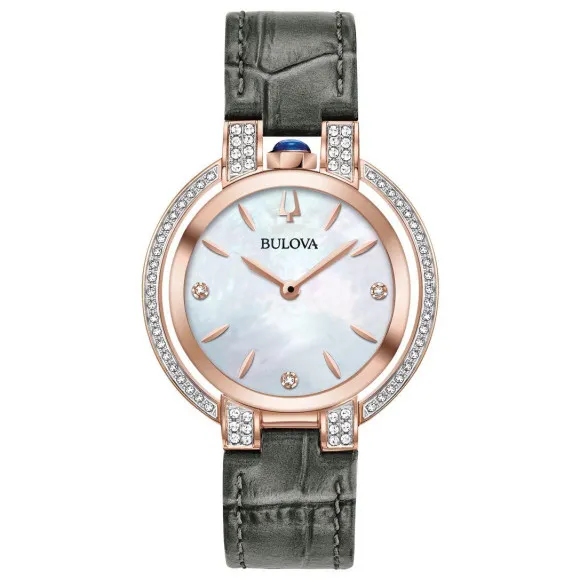 Embodying elegance and an air of timeless grace, the Bulova® Analogue 'Rubaiyat' Women's Watch 98R268 is not just a timepiece; it's a sparkling homage to the art of watchmaking. With a rose gold stainless steel round case measuring 35mm in diameter and a slender 8mm profile, this watch is a statement of luxury that sits comfortably on the wrist. The 41mm lug to lug height ensures the watch maintains a balanced presence. A stunning mother of pearl dial, protected by resilient sapphire glass, enhances the watch's visual appeal, reflecting light with every movement. Fitted with a high-quality quartz movement, it promises precision and reliability, narrated through its classic analogue display. The grey leather strap, comfortably 19cm in length and 16mm in width, brings a sense of warmth and soft femininity that complements the case, and is secured by a traditional buckle clasp. Functionality meets form, as this watch is also water-resistant up to 3 bars, offering protection from accidental splashes or brief immersion in water.Shop Bulova 98R268 at Ormoda