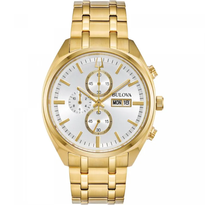 Introducing the Bulova® Chronograph 'Surveyor' Men's Watch 97C109, a timepiece that speaks volumes of its wearer's sophistication and esteem for time-honored craftsmanship. Exuding a masculine appeal with a professional touch, this watch is the perfect companion for the gentleman who appreciates both luxury and functionality. A pilot style that captures the essence of aviation-inspired design, the Surveyor boasts a stunning 42mm gold stainless steel case with a matching gold band, creating a look that is both commanding and elegant. The precision of its quartz movement ensures reliability, while the silver dial under mineral glass combines resilience with a friendly, inviting glow. Features such as a date display and chronograph functionality add layers of practicality, making this timepiece a smart choice for everyday wear or special occasions. Encased in a rounded silhouette, with a case thickness of 12mm, the watch feels reassuringly solid on the wrist without compromising on comfort. The 21cm stainless steel band, 19mm in width, secures with a fold over push button clasp, offering ease and security in a single mechanism. As a beacon of style and durability, the Bulova Surveyor is water-resistant up to 3 bars and made to endure alongside the rhythms of an active lifestyle. The enduring spirit of Bulova is showcased in this exquisite model, promising to be a treasured addition to any collection.Shop Bulova 97C109 at Ormoda