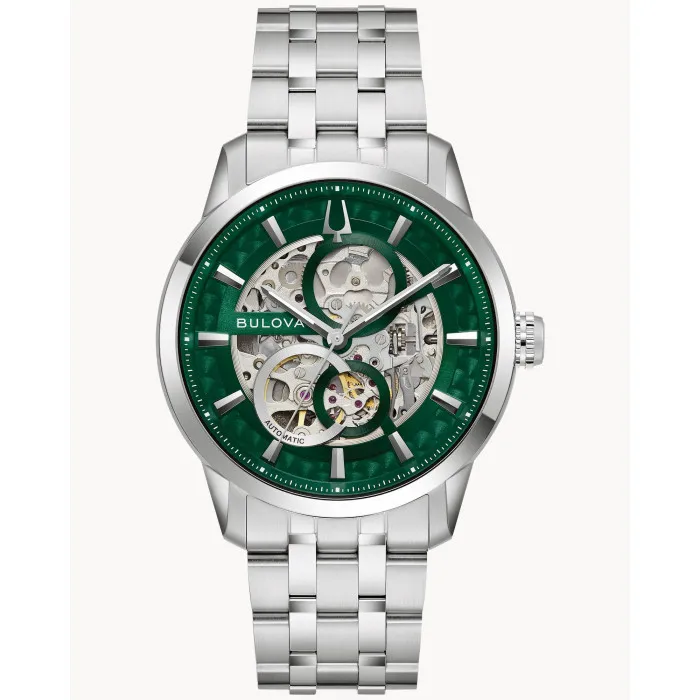 Introducing the Bulova® Analogue 'Sutton' Men's Watch 96A329, a masterpiece that redefines classic elegance for the modern man. The first thing you notice is its stunning green dial, which contrasts beautifully with the robust silver case made from high-quality stainless steel. The round design, with a thickness of 12mm, strikes a perfect balance between sleekness and presence. At 40mm in diameter, this watch sits comfortably on the wrist while making a bold statement of style. Powered by an automatic movement, the watch ensures precision and reliability, showcasing Bulova's commitment to craftsmanship. The sapphire glass window offers both clarity and durability, protecting the intricacies of the dial from scratches while enhancing the overall aesthetic. With an impressive 3-bar water resistance, it provides the peace of mind that comes with knowing your timepiece can withstand everyday life. The watch band, also crafted from stainless steel, complements the case perfectly. Measuring 19mm in width and 21cm in length, the band is fitted with a deployment clasp that guarantees a secure and comfortable fit. Its lug-to-lug height of 46mm ensures that the watch sits flawlessly on varying wrist sizes, offering both style and practicality. Whether you're dressing up for a formal occasion or going for a casual look, the Bulova Analogue 'Sutton' is a versatile companion that enhances any outfit.Shop Bulova 96A329 at Ormoda