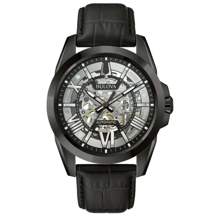 Immerse in the sophistication of Bulova, an iconic watchmaker renowned for its commitment to craftsmanship, innovation, and precision since 1875. The Bulova Analogue 'Sutton Skeleton' Men's Watch 98A304 captures the essence of the brand's heritage, offering a masterful blend of timeless style and contemporary engineering. This watch is not just a timepiece, but a statement of enduring luxury and meticulous design. Crafted for the discerning man, the Sutton Skeleton is a masterpiece of horological artistry. A stunning 42mm black stainless steel case encircles the intricately designed silver skeleton dial, allowing a glimpse into the watch's inner workings. Powered by a precise automatic movement, this watch is a testament to Bulova's relentless pursuit of watchmaking excellence. The round case, paired with a sleek 12mm thickness, exudes a masculine allure that compliments the wrist with poise and confidence. Protected by durable mineral glass, the dial is designed for both clarity and durability. Embracing the wrist is a supple leather band in black, measuring 21cm in length and 21mm in width, fastened securely with a classic buckle. At 52mm lug to lug height, the watch maintains a prominent yet comfortable presence on your wrist. Designed to withstand the challenges of everyday life, it boasts a water resistance of 10 bars, ensuring reliability in diverse conditions. The analogue display reaffirms the watch's sophistication, offering an elegance that transcends passing trends. Choosing Ormoda is choosing a legacy of quality. Enjoy free express shipping with premium couriers, meaning your new Bulova timepiece arrives swiftly and securely. Peace of mind is assured with a 30-day free return policy, a two-year warranty, and the support of our expert customer service team. Ormoda's experience, honed since 1976, guarantees that your satisfaction is not just expected, but demanded.Shop Bulova 98A304 at Ormoda