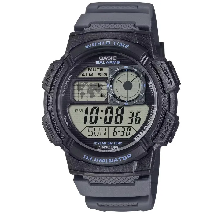 Introducing the Casio® Digital 'Casio Collection' Men's Watch AE-1000W-8AVEF, a timepiece that marries functionality with style. Designed with a bold black resin case, measuring 43mm in diameter and 13mm in thickness, this watch is resilient yet striking. The black dial features mineral glass for protection that enhances clarity, presenting a modern digital display that excels in both its functionality and aesthetics. Whether you are keeping track of time with its day-date calendar or utilizing features such as the stopwatch, countdown timer, world time, and alarm, this watch is designed to meet the diverse needs of today’s man. The 10-bar water resistance thrives in both routine conditions and adventurous outings, ensuring that it remains functional wherever you wear it. The Casio Collection's sporty yet sophisticated appeal extends into the comfortable blue plastic band, which measures 21cm in length and 22mm in width, perfectly complimented by a durable buckle clasp for security. Weighing a mere 40g, this watch is as light as it is robust, making it an ideal companion for daily wear or those special encounters. It reflects a blend of Casio's storied heritage and innovation, catering specifically to men who appreciate both elegance and practicality. With a focus on delivering performance-driven features, it is suitable for anyone from the corporate professional to the outdoor enthusiast.Shop Casio AE-1000W-8AVEF at Ormoda