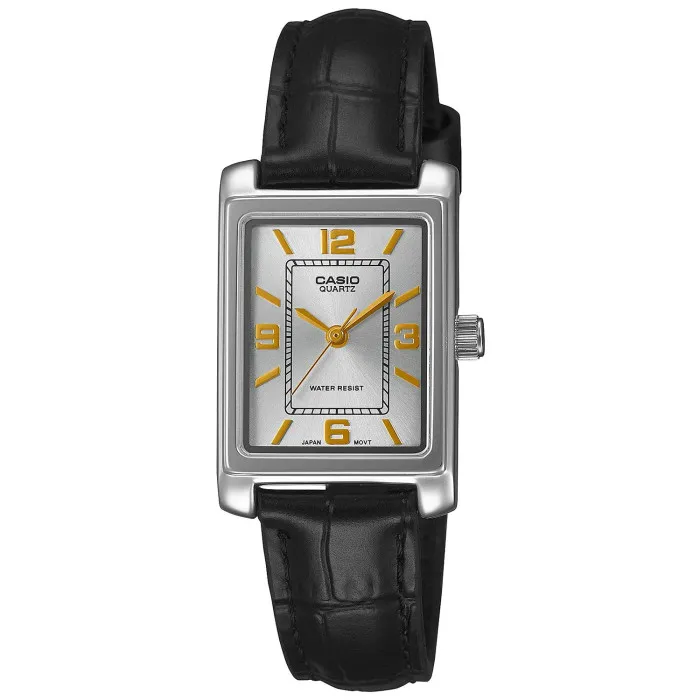 Introducing the captivating Casio® Analogue 'Collection' Women's Watch LTP-1234PL-7A2EF, where elegance meets practicality in perfect harmony. Envisioned for the modern woman, this watch showcases a beautiful rectangular case crafted from durable brass, encasing a delicate silver dial that radiates refined sophistication. The timeless quartz movement ensures precision in every tick, making it not just an accessory, but a reliable companion throughout your day. Designed with versatility in mind, this casual watch seamlessly transitions from daytime meetings to evening outings. The sleek black leather band not only adds a touch of modern flair but also offers superior comfort with a length of 19cm. The band is 12mm in width, making it a stylish fit for any wrist size. A secure buckle clasp keeps the timepiece firmly in place, allowing you to wear it with confidence. The watch is water resistant up to 3 bars, ensuring it can withstand splashes and brief immersions without compromising its integrity. With a case length of 26mm, thickness of 7mm, and width of 21mm, this piece is thoughtfully designed to be lightweight and comfortable at just 24 grams. The mineral glass dial window enhances readability while providing a protective shield against daily wear. Ideal for those who appreciate a blend of timeless design and practical functionality, this watch is not just an accessory; it’s a statement of sophistication and elegance.Shop Casio LTP-1234PL-7A2EF at Ormoda